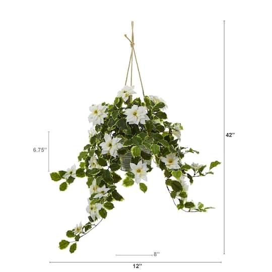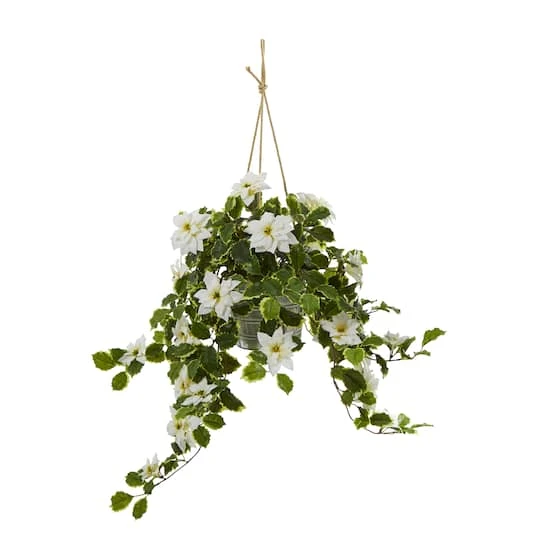 Showcase seasonal cheer with this artificial plant boasting an overgrowth of variegated holly leaves, nestled throughout with poinsettia blossoms designed with naturally occurring details – all of which feels real to the touch. Reaches 3.5 ft. long from a hanging metal bucket.