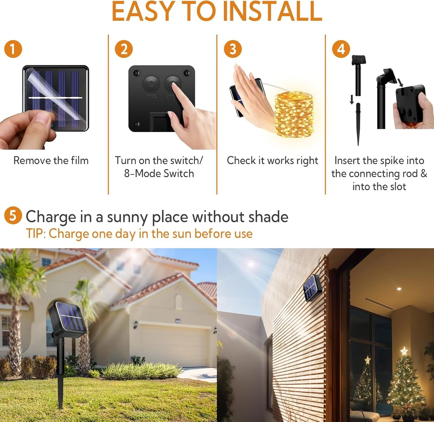 【Easy Installation & Tangle-free Design】The user-friendly design allows for quick and effortless installation. Simply place the solar panel in direct sunlight and secure the lights wherever desired. The tangle-free design prevents annoying knots and makes decorating hassle-free.