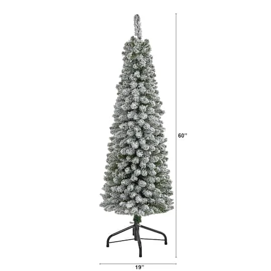 Create a winter wonderland scene in a limited space environment with the help of this flocked artificial Christmas tree! Perfect for the smallest, tightest spaces because of its narrow, pencil-like design, it boasts a tight silhouette made up of 318 easy-to-bend branch tips for showcasing your favorite holiday ornaments, all beautifully flocked with faux snow to help evoke the ultimate winter setting. Carefully stabilized on a metal stand, this space-saving 5ft. tall flocked artificial Christmas tree will not only make decorating a breeze but ensure your home is looking picturesque all throughout the holiday season – no matter your space situation. Artificial Christmas Trees are manufactured using synthetic materials, such as polyester material or plastic, and are well designed and constructed to be life-like in appearance. This item will need to be re-shaped when removed from the secure box to allow it to reach its fullest size.