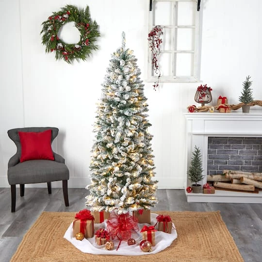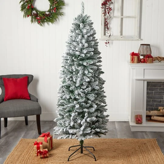 Transform your home into an enchanting winter wonderland with this flocked artificial Christmas tree. If you dream of a white Christmas, these artificial trees are designed to mimic the texture and foliage of real trees with their upward sloping branches that can easily house mini ornaments. Pre-strung with 250 LED lights for a warm, candle-like glow, all that’s missing are your ornaments. Standing at 6 ft. from a metal stand (included in height), this flocked tree complements spaces that need some Christmas love. Everyone can have a white Christmas even if they live in the tropics. Item will need to be re-shaped when removed from the box; this tree can easily bend for reshaping purposes. Please separate and fluff to achieve desired fullness. Measurements are calculated from the furthest outstretched dimension. This item is manufactured using synthetic materials and are well designed and constructed to be life-like in appearance. No maintenance needed for this artificial tree. Wipe clean with a soft dry cloth.