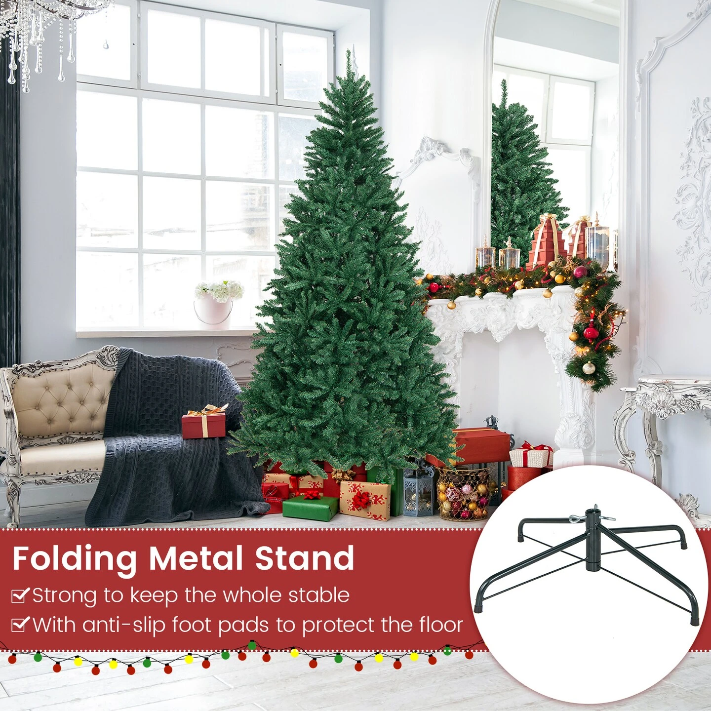 Strong Metal Stand: Welcome the wobble-free Xmas tree! It’s supported by a folding metal stand with 3 bolts, which is perfectly reinforced to gain higher strength. Also, it comes with anti-slip foot pads that safeguard your floor from being scratched.