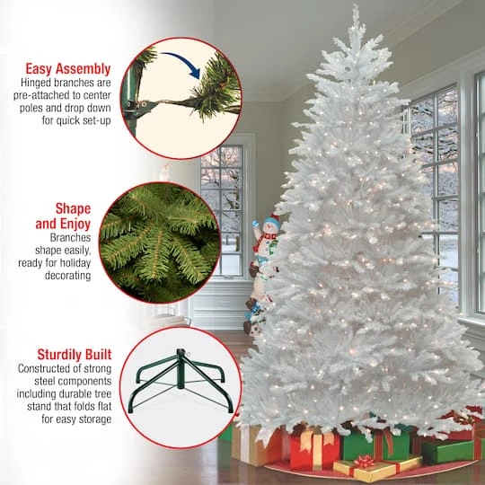 The Dunhill white fir is an attractive alternative to the traditional green holiday centerpiece. Your colorful holiday trimmings will really stand out on this bright white background. The Dunhill white is pre-strung with clear lights that remain lit even if a bulb burns out. This three section tree features hinged branches for ease of assembly and comes with a sturdy folding metal tree stand.