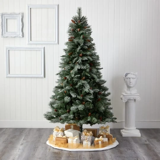 Evoke a winter wonderland with this snowy artificial Christmas tree! Maintenance-free, it boasts a robust silhouette of snow-dusted foliage made up of bendable branches for accenting with holiday ornaments, accented throughout with faux pinecones that look incredibly lifelike. Stabilized on a metal stand, this 7ft. tall snowy artificial Christmas tree will ensure your home is holiday-dressed for years to come.