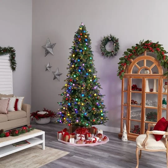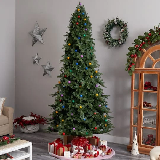 Light up your home this holiday season with the help of this artificial Christmas tree. Easy to build and entirely maintenance-free, it boasts a traditional silhouette of seasonal evergreens, made up of 2330 easy-to-bend branches, perfect for showcasing all your favorite holiday ornaments. Arriving pre-strung with 1150 multicolored LED lights,125 globe lights and carefully stabilized on a metal stand, this festive 9.5 ft. tall artificial Christmas tree will undoubtedly be a focal point throughout the holidays, year after year. Faux Christmas Trees are manufactured using synthetic materials, such as polyester material or plastic, and are well designed and constructed to be life-like in appearance. This item will need to be re-shaped when removed from the secure box to allow it to reach its fullest size. Your artificial Christmas Tree will look beautiful for years to come; simply wipe clean with a soft dry cloth when needed.
