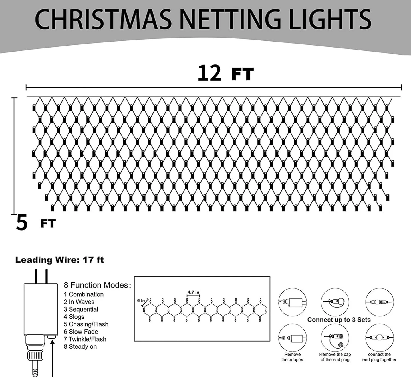 Christmas Net Lights: Christmas 360 LED net lights, use UL-certified 29V low-voltage plugs to ensure the safe use of the product. The size is 12 FT X 5 FT, the lead length is 16.5FT, and the horizontal distance between each lamp bead is 4.7inch. Place or hang the exquisite net lights on the trees, grass, bushes or any place you want, very easy to decorate.