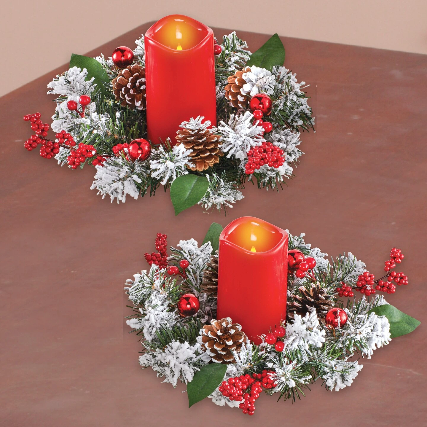 Frosted Pine Candle Rings and Red Flameless Candles with Pinecones, Winter Holiday Centerpiece and Tabletop Decorations, 2 Pc
