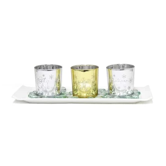 Add some festive décor to your space with this set of Winter Wonderland candle holders! This arrangement includes three evenly sized glass candle holders atop a ceramic plate, complemented by surrounding glass beads. Perfect for any room, this accent piece will complete the look of your holiday dreams! Included are: