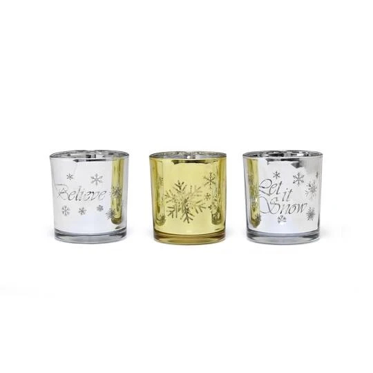 “Let it Snow” in silver and white, “Believe” in silver and white, and Snowflake pattern in gold and white. For safety precautions, we recommend using a flameless battery operated candle (not included). Suitable for holiday home décor, or a centerpiece at a holiday party!