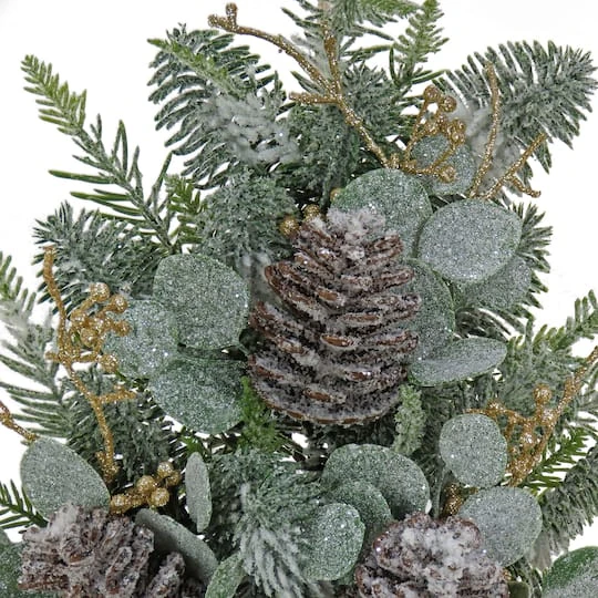 This long stem spray features frosted pine and eucalyptus leaves with sparkly glitter accents. Add this to your holiday decorations for custom trimmings and to take your Christmas decorating to the next level.