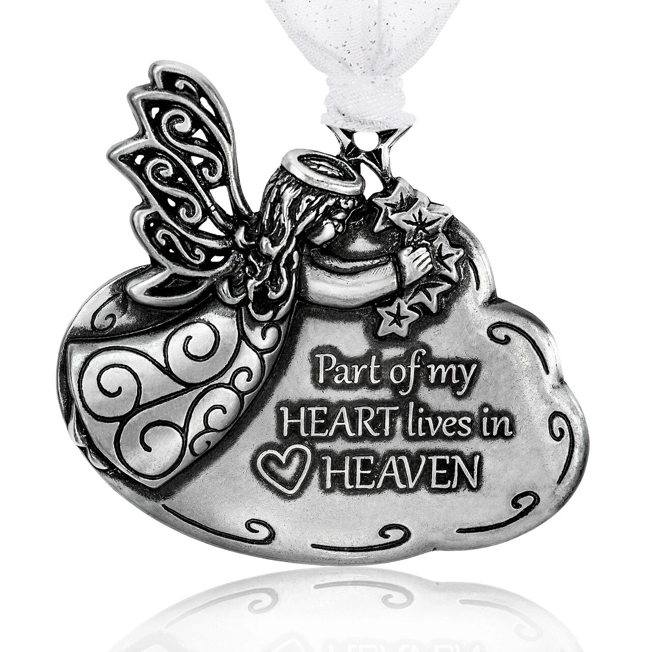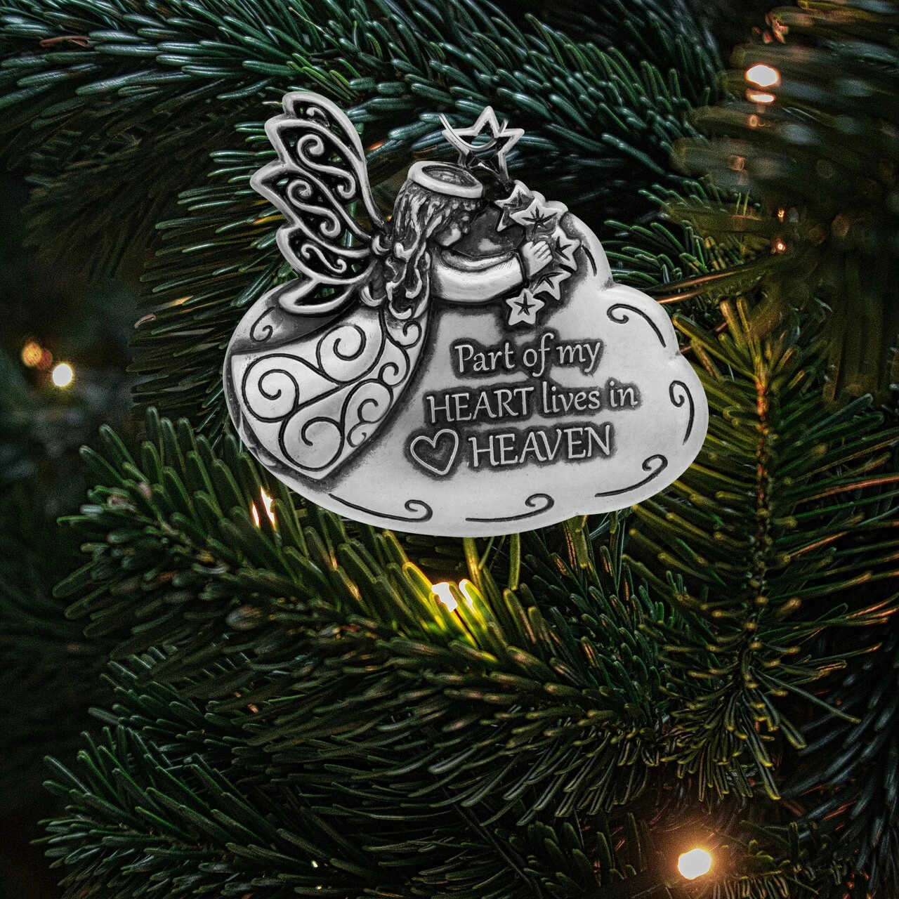 A beautiful pewter finish angel on a cloud inscripted with “Part of my HEART lives in HEAVEN” ornament. The ornament comes with a ribbon, making it easy to display on your tree or give as a thoughtful gift.