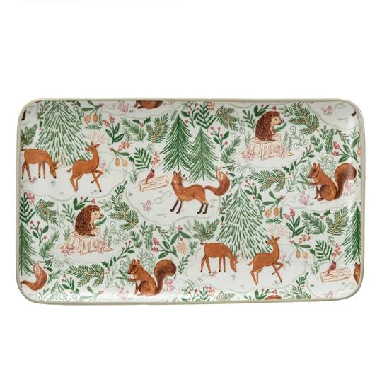 This stoneware platter with a woodland pattern is a delightful way to bring some nature-inspired charm to your table. Showcasing a lovely design of flowers, leaves, birds and animals in rustic, woodsy colors, this platter is made of high-quality stoneware that is sturdy and microwave-safe, making it ideal for everyday use or special occasions. Whether for serving favorite dishes or displaying it as a decorative accent, this platter will add some warmth and personality to your home.