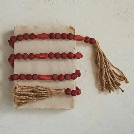 This paulownia wood bead garland with jute tassels in a deep burgundy hue is a statement of refined taste and natural beauty. Each bead is carefully crafted from Paulownia wood, known for its durability and lightness, and accented with elegant jute tassels. The garland’s length of 72″ and height of 0.75″ make it a perfect fit for a variety of decorating needs, from creating a focal point in a room to adding a touch of sophistication to a festive occasion. It’s a piece that combines the rustic charm of wood with the artisanal appeal of hand-tied tassels, creating a timeless and versatile addition to the décor collection. Whether draped over a mantel, wrapped around a banister, or laid across a table, this garland is sure to enhance the ambiance with its rich color and texture. An adaptable décor piece that adds a rich, warm tone to any interior design palette. Perfect for enhancing the aesthetic of a room or adding a decorative touch to special events. Made of lightweight Paulownia wood and natural jute, this garland is both stylish and sustainable.
