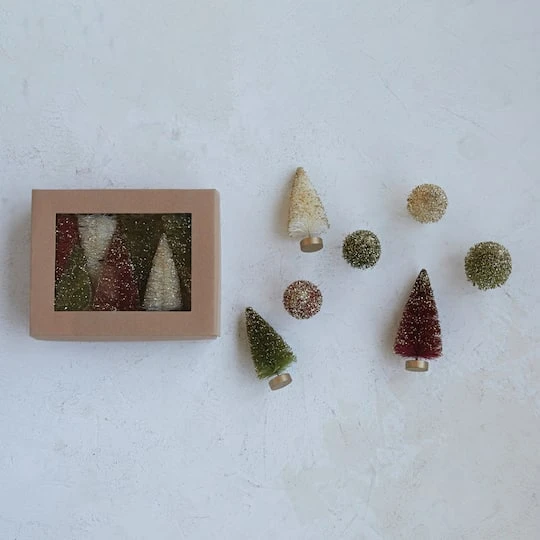This boxed set of seven glitter and gold finish sisal bottle brush trees with wood bases in three colors adds a glamorous and dazzling touch to any holiday décor. Add a touch of magic to holiday displays with our stunning collection of figures and figurines, including an array of festive silhouettes, perfect for celebrating the season in style. Each holiday décor item is carefully crafted with the utmost attention to detail to ensure that it will be cherished for years to come.