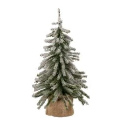 The Flocked Mini Village Pine is our series of small tabletop trees and features short pine needles in a mix of light and dark green with a coating of “snow”. The tree has a lovely downswept shape, enhancing its realistic quality. It comes potted in a rustic brown burlap base. Ideal for adding a winter wonderland touch to your décor. Note: branches are compressed for shipment and need to be fluffed out upon arrival to look like the photo.