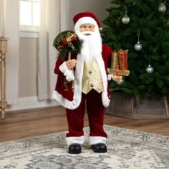 Celebrate the season with a classic Santa Claus figure, dressed in his iconic red suit adorned with white faux fur trim. The intricate embroidery features festive holly berry leaves accented with gold beads, adding a touch of holiday charm. His metallic gold vest shimmers beneath the twinkling lights, while his hat, complete with a cheerful jingle bell, brings joy to every room. With a gift bag slung over his shoulder and presents in hand, this Santa is ready to spread holiday cheer throughout your home.