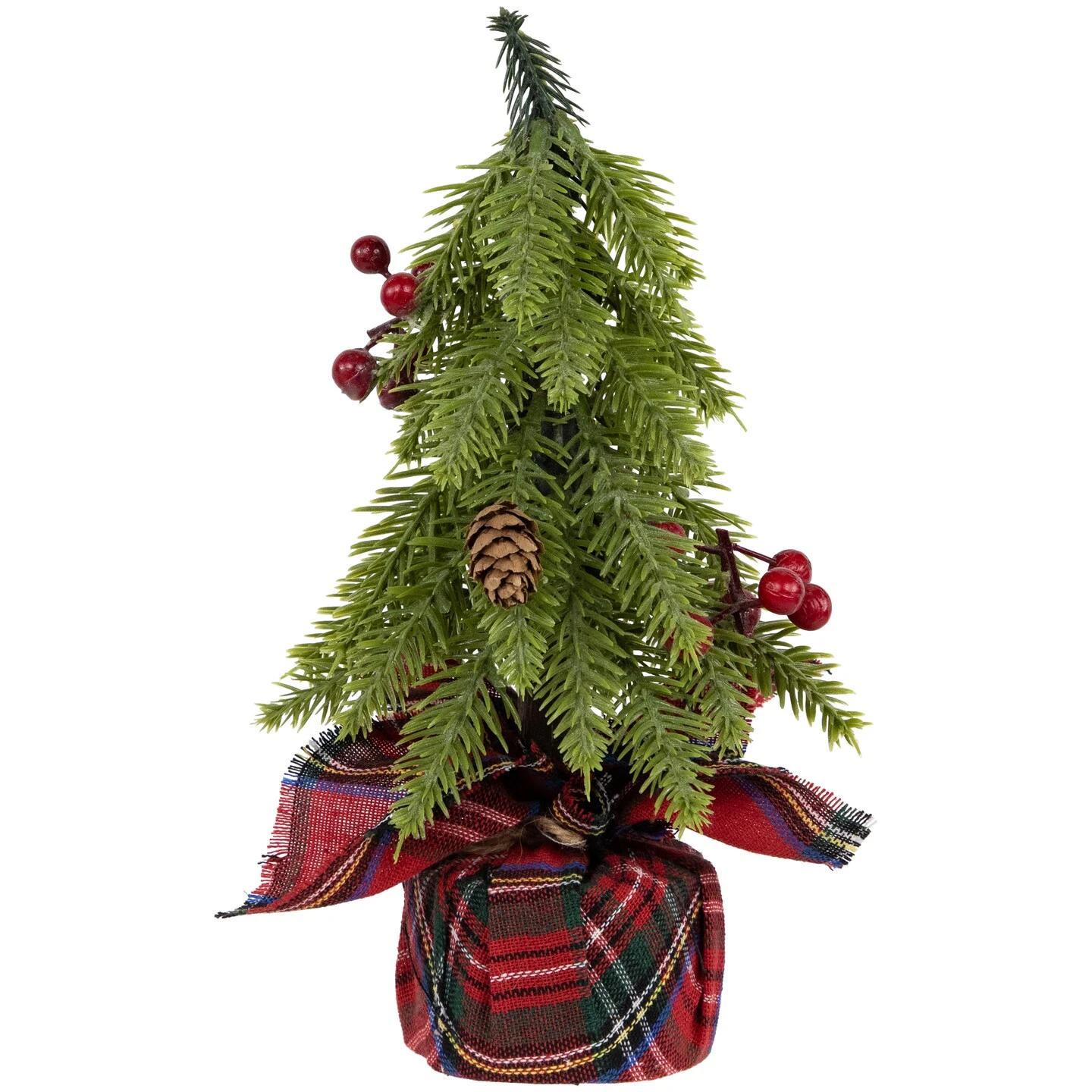 Add a festive touch to your holiday decor with this set of mini artificial Christmas trees. Standing at 9 inches tall, these charming trees are accented with pine cones and red berries, bringing a rustic, wintery feel to any space. The trees come with a red plaid fabric base, adding a cozy and traditional element to your seasonal setup. Perfect for tabletops, mantels, or anywhere you want to infuse some Christmas spirit into your home.