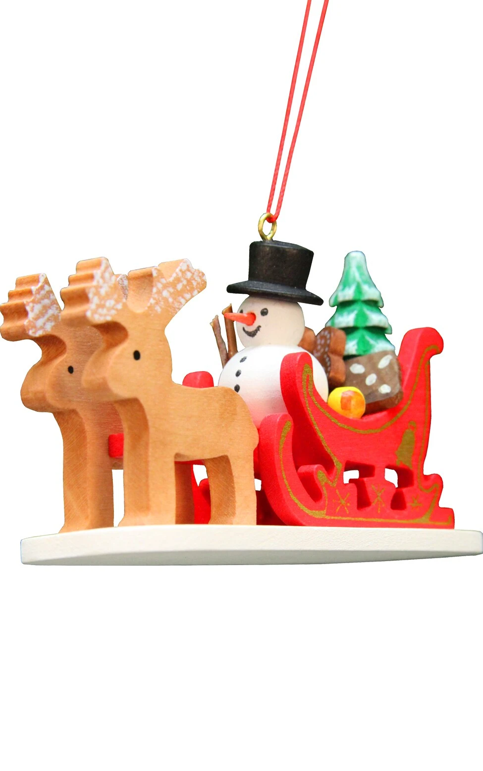 Christian Ulbricht hanging ornament Snowman riding on a sled pulled by reindeer Made in Germany