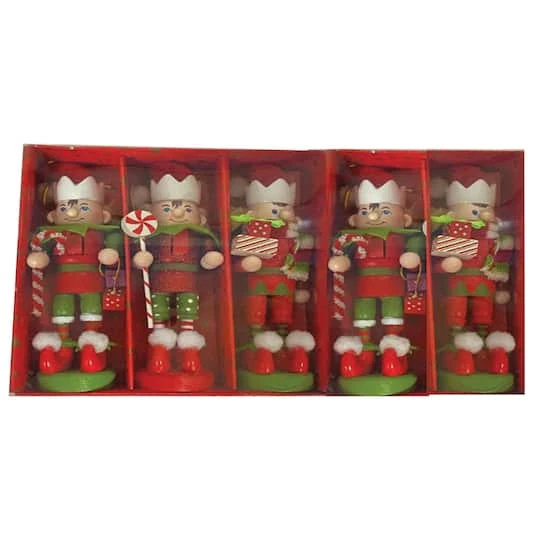 This quintet of colorfully outfitted elf nutcracker ornaments add a touch of holiday fun to your Christmas tree decorations. Two elves carry presents, two elves carry candy canes, and one elf carries a peppermint-topped staff. Made from long lasting MDF wood. Beautifully handcrafted from wood and hand painted, this set of five 5″ Elf Nutcracker Ornaments is sure to provide many years of pleasure.